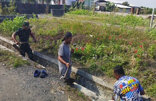 Jelang Agustus - An, Serda Alfian Bersama Warga Desa Tulungrejo Kerja Bakti Bersihkan Lingkungan